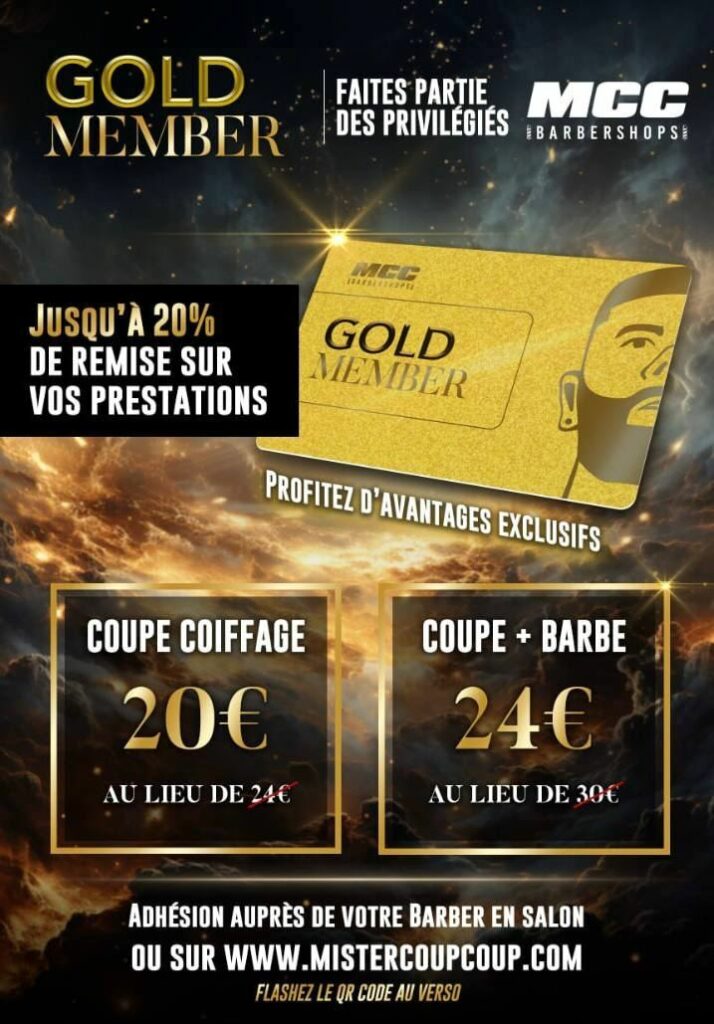 Après le franc succès de l’an passé ! Vous êtes nombreux à nous demander si l’opération GOLD MEMBER allait être renouvelée. C’est  désormais chose faite ! Vous pouvez souscrire votre abonnement en salon lors de votre  prochaine visite ou directement sur notre site dans la rubique (MCC  Barbershops / GOLD MEMBER) Et profitez d’avantages exclusifs comme jusqu’à 20% de remise sur vos prestations à longueur d’année et de surprises ponctuelles !
